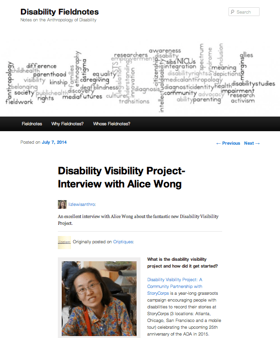 Disability Fieldnotes. (July 7, 2014). Disability Visibility Project- Interview with Alice Wong. (Re-post).